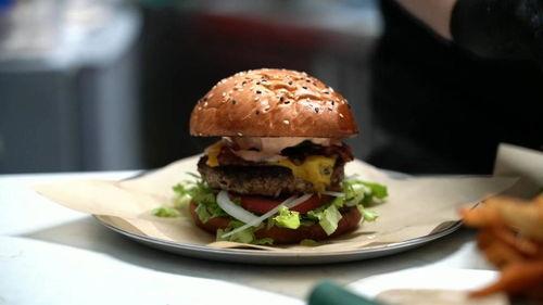 接下来,就是制作汉堡的关键步骤了。首先,将牛肉饼煎至两面金黄,然后放在面包上。接着,加入生菜、番茄、洋葱、黄瓜等蔬菜,最后撒上芝士,放入烤箱烤至芝士融化。